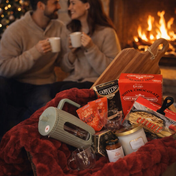 This cozy. indulgent gift basket comes with a lovely French press, 2 coffee mugs, a big candle, a barista’s cappuccino mix, two hot chocolate mix, a box of cookies, a cheddar brie, an apple crumble mix in a cast iron skillet, a wooden serving board, an ultra soft throw all inside a beautiful large wicker basket – perfect for relaxing by the fire and savouring a quiet, feel-good moment.