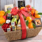 Wooden tray with seasonal fruits, crackers, cheese, tea, chocolates, and nuts. Customizable with ribbon or mugs.