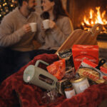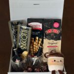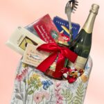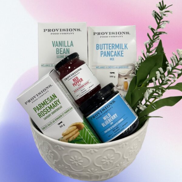 A bright, curated gift bowl filled with Provisions Food Company goodies – pancake and scone mixes, savoury shortbread, and jars of jam. Styled in a big ceramic bowl with some greenery perfect for a gift.